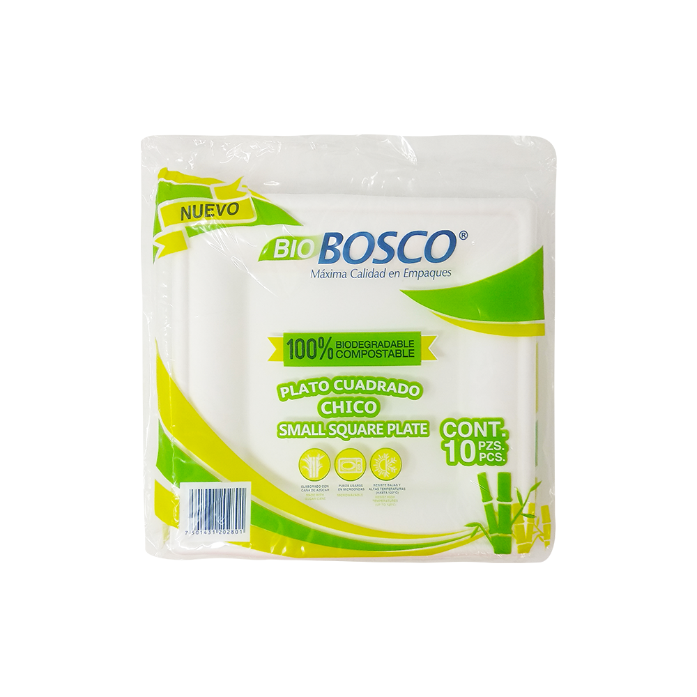 Plato Bio cuadrado chico, mediano y grande. 100% biodegradable, compostable, elaborado con caña de azúcar, puede usarse en microondas, resiste a bajas y altas temperaturas (hasta 120° C).