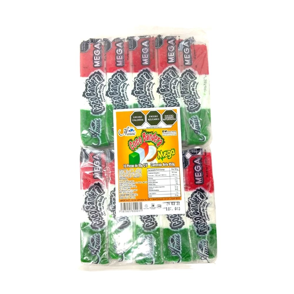Coco bandera Mega. Cada uno envuelto individualmente. Ideal para meriendas, piñatas, fiestas o tu negocio. ¡No te quedes sin probar su delicioso y tradicional sabor a coco!