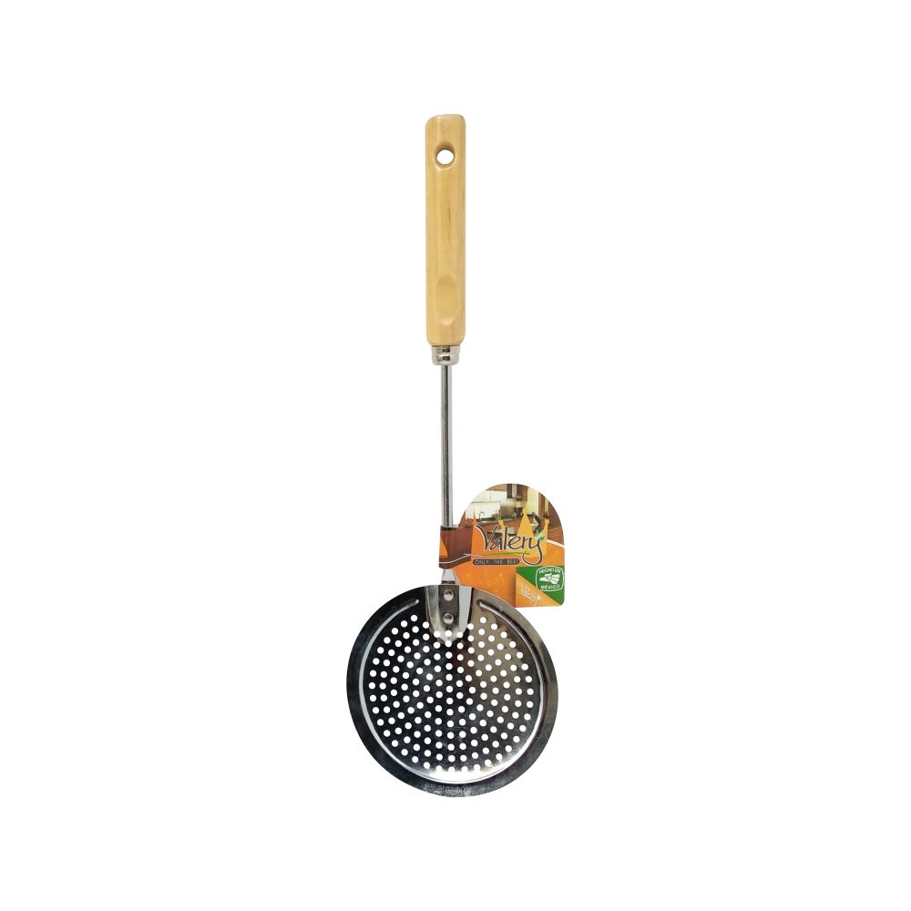 Espumadera de acero inoxidable con mango de madera. Perfecta para retirar la espuma de tus caldos y preparaciones. ¡Un básico en tu cocina! ¡Comercial Zazueta, donde todo lo encuentras!