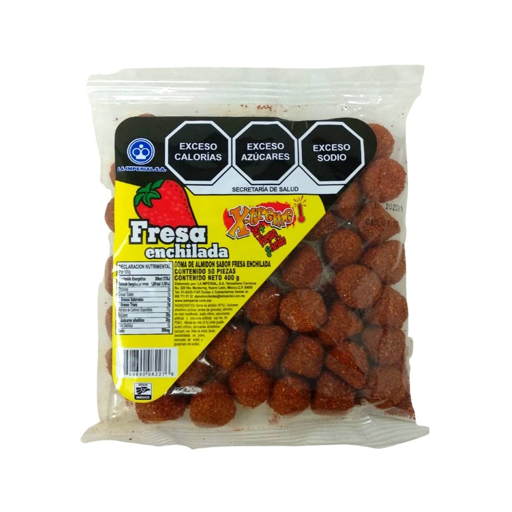 Deliciosas gomitas de almidón enchiladas de fresa. ¡Disfruta y comparte su picosito sabor!