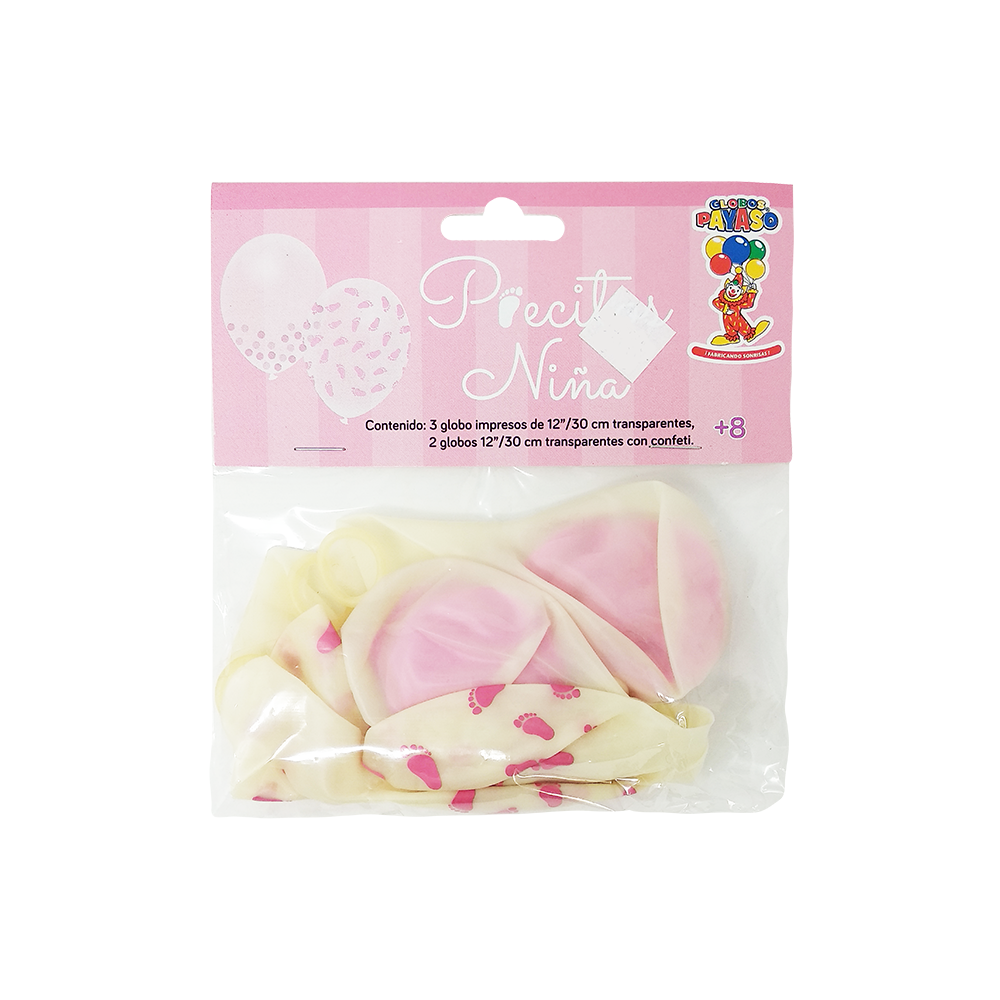 Características y dimensiones: 3 globos #12 (30 cm) color transparente e impresión en rosa pastel y 2 globos #12 (30 cm) color transparente rellenos de confeti rosa pastel.