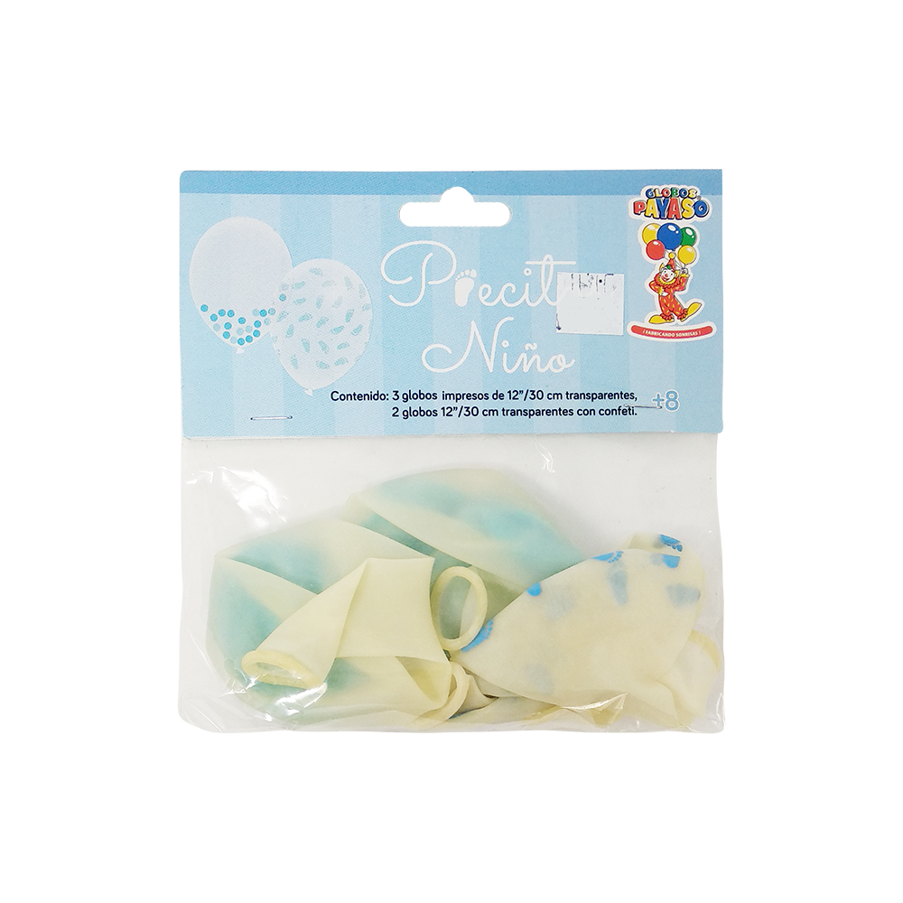 Características y dimensiones: 3 globos #12 (30 cm) color transparente e impresión en azul pastel y 2 globos #12 (30 cm) color transparente rellenos de confeti azul pastel.
