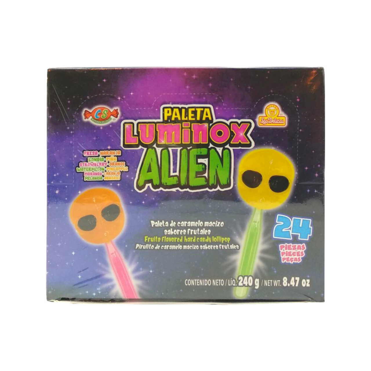 Deliciosa paleta de caramelo macizo de sabores frutales con divertidas formas de alien y con una varita luminosa.