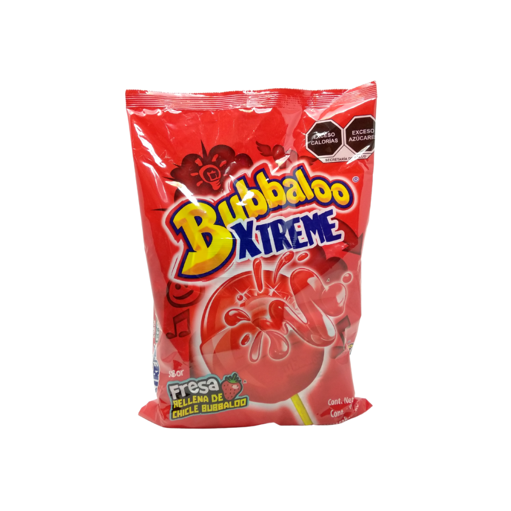 Deliciosa paleta de caramelo con goma de mascar de sabor fresa o mora azul ¡Disfruta del clásico dulce Bubbaloo! Perfecto para bolsitas de dulces.