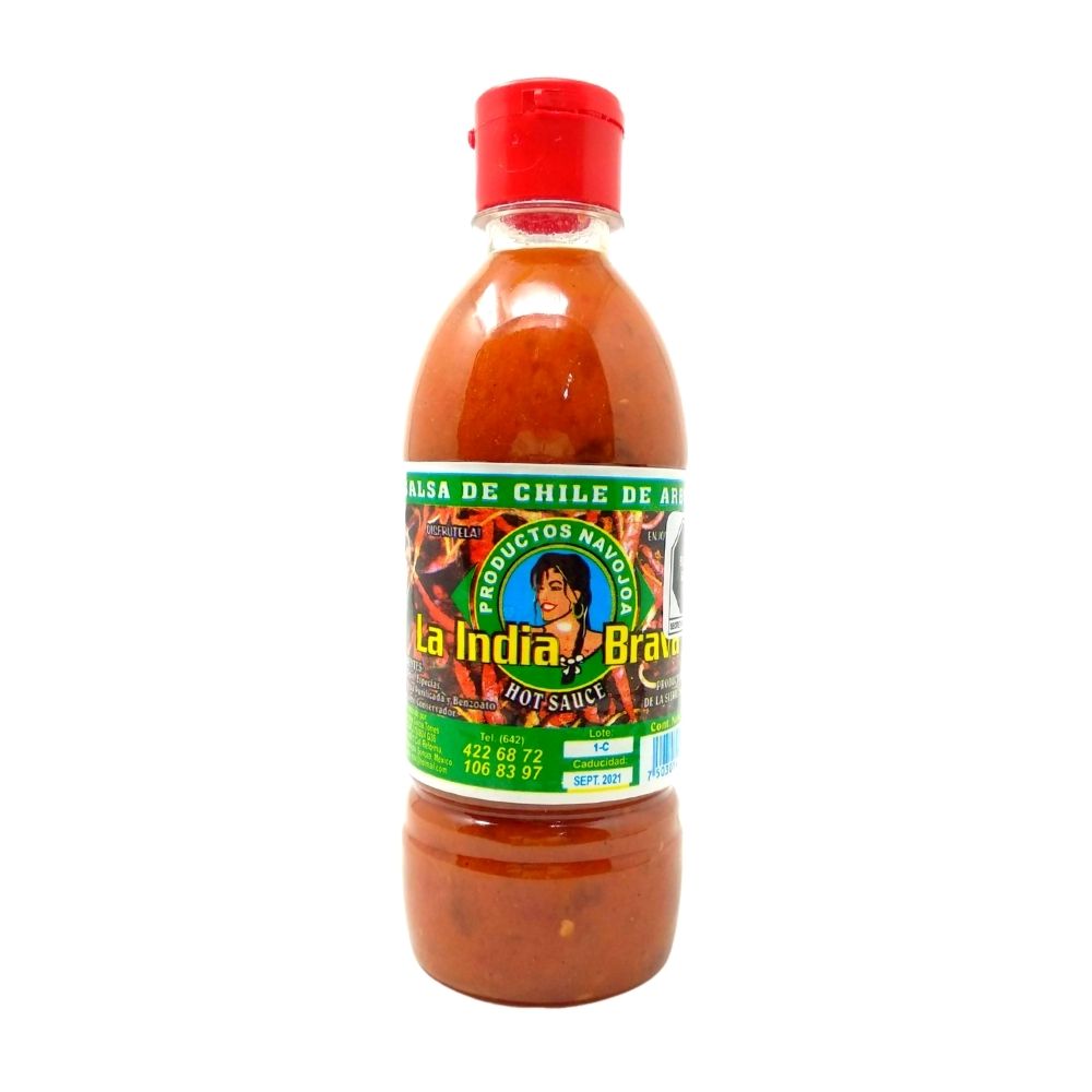 Disfruta de la deliciosa y picosita Salsa de Chile de árbol La India Brava. ¡Dale el toque a tus comidas con su riquísimo sabor!