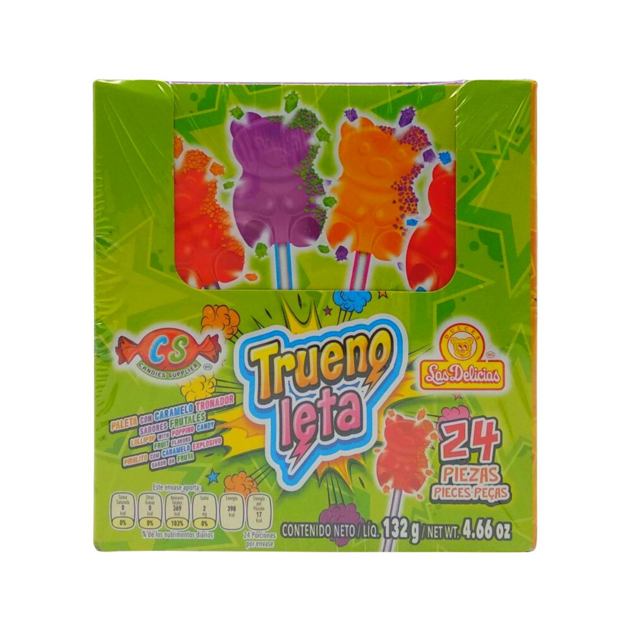 Paletas con caramelo tronador de sabores frutales y en forma de divertidas figuras de osos. ¡Perfectos para bolsitas de dulces!